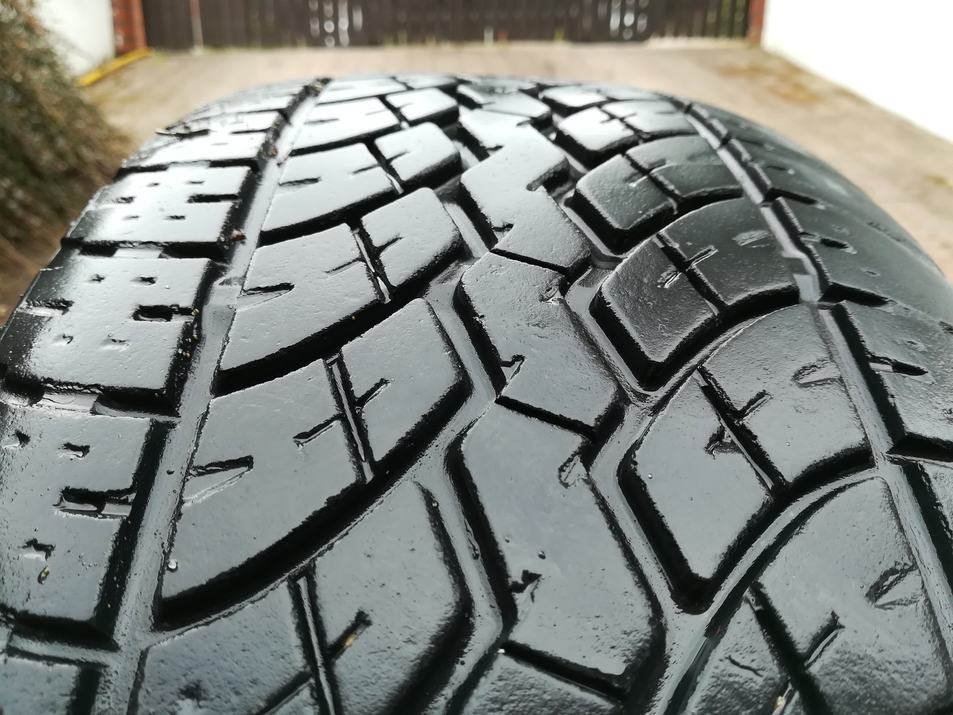 Opony zużyte, w środku bieżnik OK ale wytarte na zewnątrz - do wymiany.