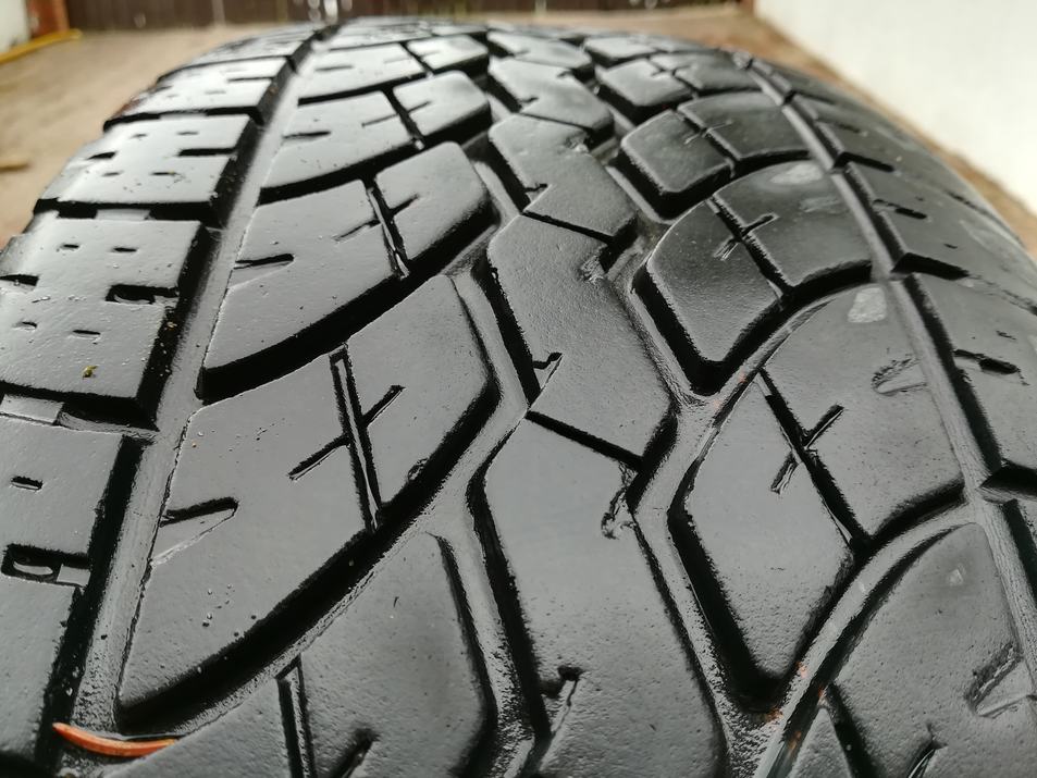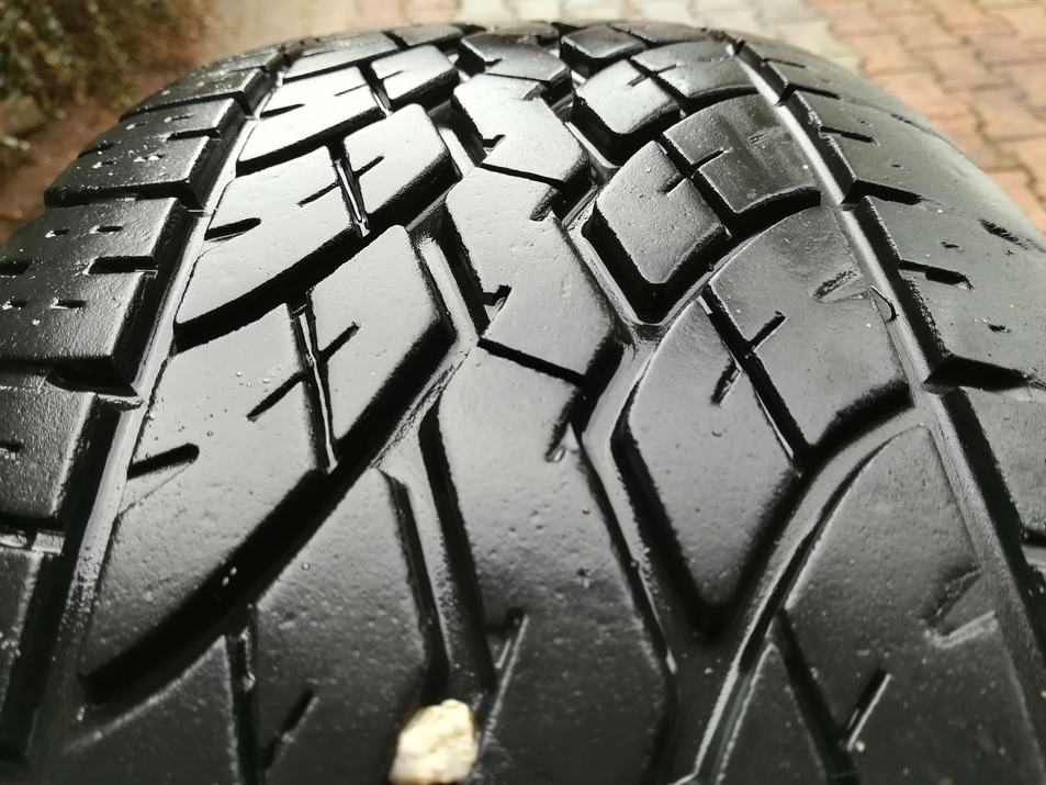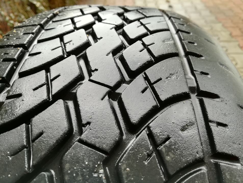 Opony zużyte, w środku bieżnik OK ale wytarte na zewnątrz - do wymiany.